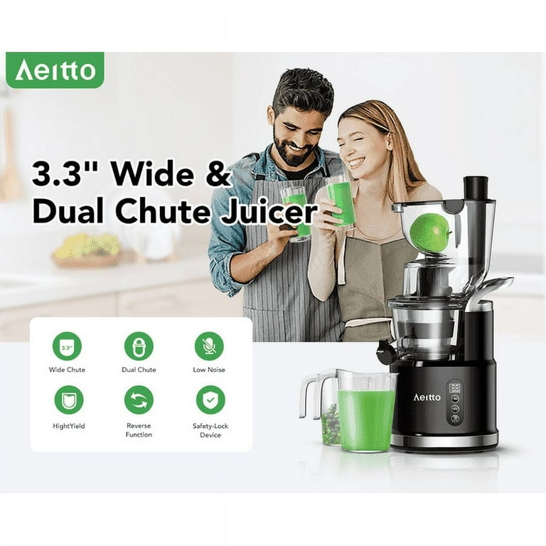 🍐- Aeitto vertical juicer with 3.3 inch(83mm) large feed chute easily accepts larger pieces of fruits and vegetables and smaller feed chute for strip shape ingredients. It’s perfect for the whole fruit and long vegetables. Greatly reduces preparation and cleanup time. Less chopping of the ingredients also helps to reduce oxidation.